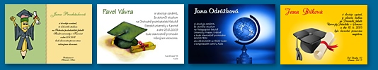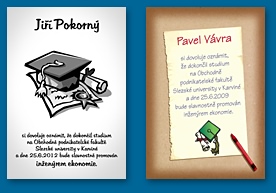 Nabízíme vám originální a neokoukané motivy promočních oznámení. Dotisk znaku univerzity a textu je u nás zcela zdarma. Na promoční oznámení lze použít i dodaný obrázek, který za mírný příplatek graficky upravíme a zhotovíme vám opravdu originální promoční oznámení, která zcela jistě zaujmou.